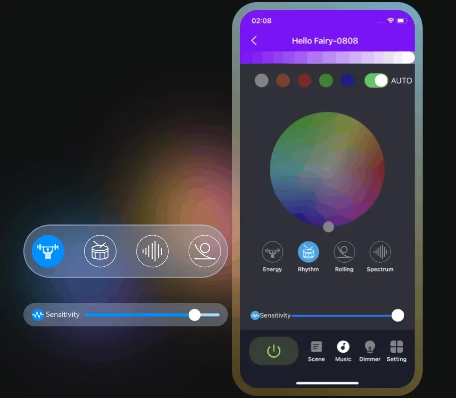 ![]() | Musical Rhythm Music Rhythm provides 4 music modes, namely: “Energy”, “Rhythm”, “Roll”, “Spectrum”. In different modes, parameters such as “Sensitivity” can be adjusted. You can also set the “Auto/Manual” mode, when you switch to the manual mode, you can set the flashing color yourself.