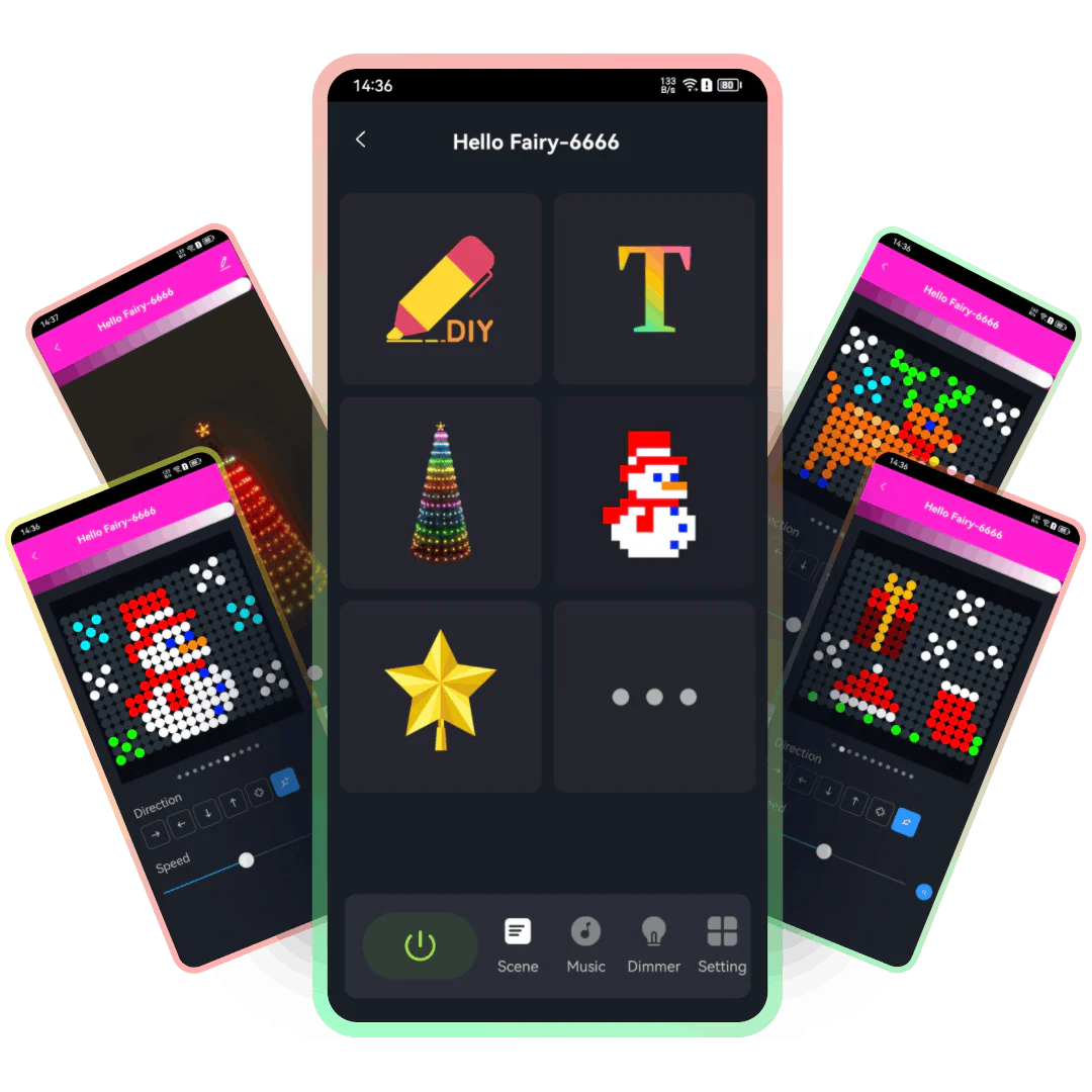 Text subtitle effects By simply entering English letters, one can generate subtitle effects and display them on the light strings in various ways such as flashing or scrolling. For example, by typing “Happy Birthday,” birthday congratulations can be displayed, or festive greetings can be shown using light strings to enhance the atmosphere during special holidays. Therefore, this feature not only expands the range and creativity of light string use but also creates more possibilities for fun. | ![]() |