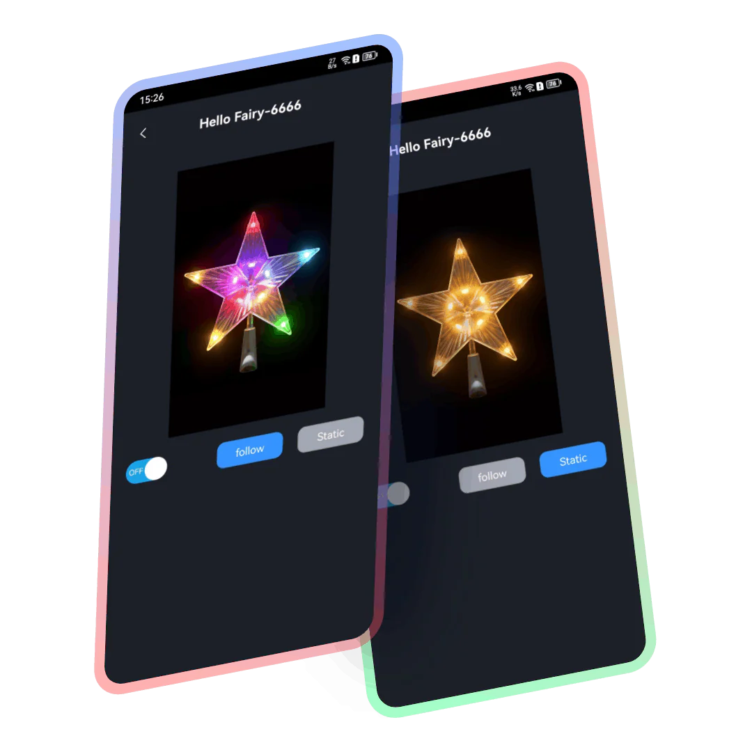 The stars on the treetop The tree-top stars provide two modes, namely “Follow” and “Static”. Follow mode means that they change together with the main string lights. You can choose the appropriate mode according to your needs. | ![]() |