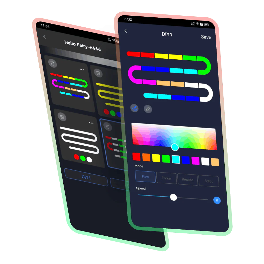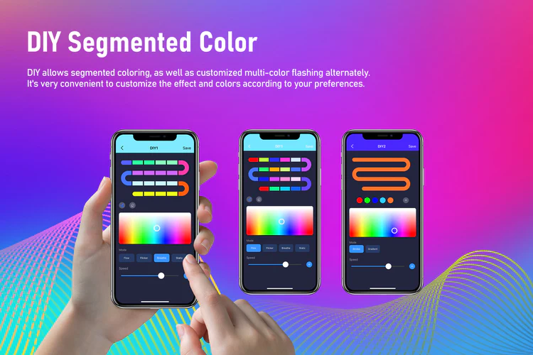 DIY allows segmented coloring, as well as customized multi-color flashing alternately. It’s very convenient to customize the effect and colors according to your preferences.