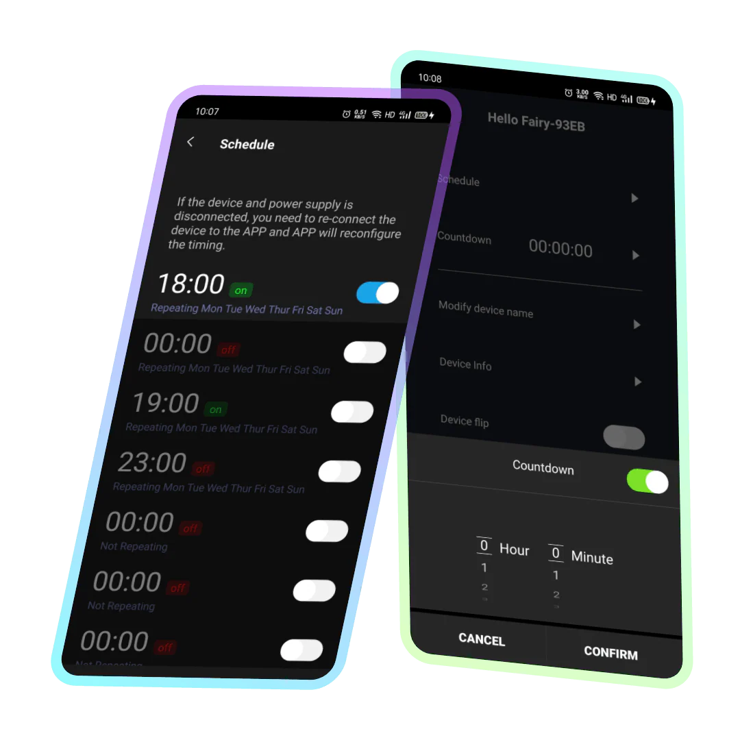 Create a timer to turn on/off the light like setting an alarm clock, which is convenient and quick to avoid forgetting; Set a countdown, the lights will turn off automatically after the countdown is over.