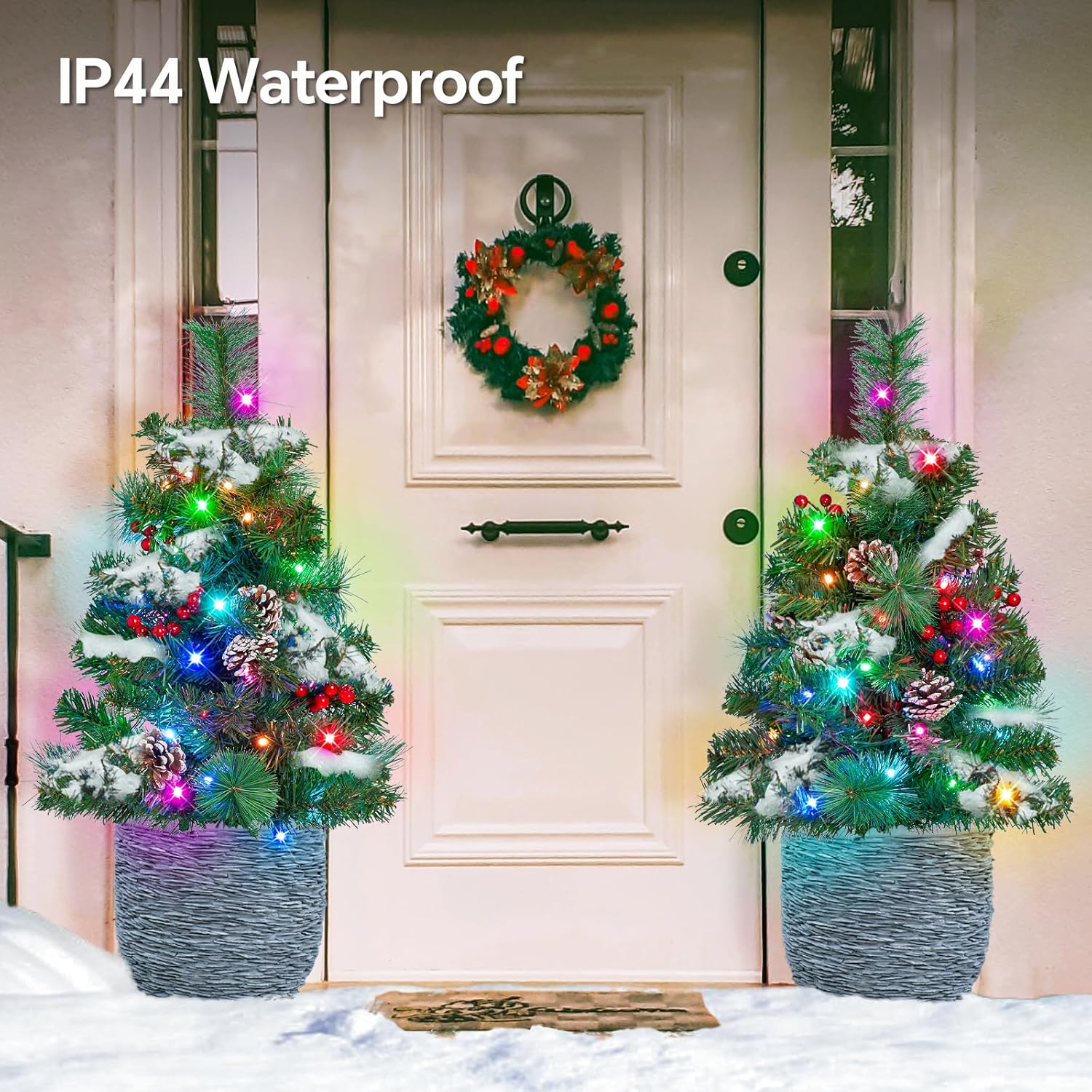 - RGBW Christmas Tree: Set of 2 smart Christmas trees with 50LED lights, red berries pine cones. IP44 Waterproof, 10FT power extension cord, Small in-ground outdoor Christmas cone tree lights, porch pathway planter pot filler decorations